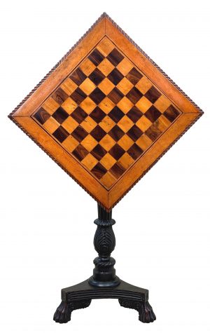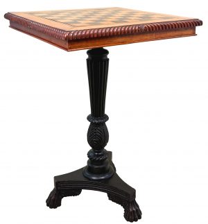 An Extremely Attractive Padouk Wood And Satinwood Early 19th Century Anglo-Indian Occasional Games Table, The Square Tilting Top With Inlaid Chess Board And Superbly Carved Gadrooned Edge, Raised On Heavily Carved, Turned And Ebonised Central Column, With Triform Platform Base And Scrolling Carved Hairy Paw Feet.