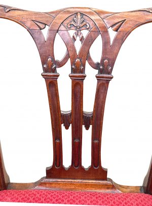 A fabulous quality, elegant and practical mahogany chair which dates to the Chippendale period of the 18th century. It can be narrowed down to this date based on the design of the carved back and square chamfered legs along with the quality of craftsmanship shown in the carved decoration and the rich mahogany timbers used for its construction. It should also be noted that the carved decoration to the back is of both an unusual, extravagant and elegant design, but also exceptionally well executed.