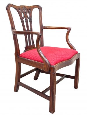 A Very Good Quality 18th Century, Georgian, Chippendale Period, Mahogany Carver Desk Armchair Having Extremely Attractive Pierced Splat With Crisply Carved Decoration To Back, Over Scrolling Arms And Shaped Drop In Upholstered Seat, Raised On Elegant Square Chamfered Legs With Attractive Moulded Decoration.
