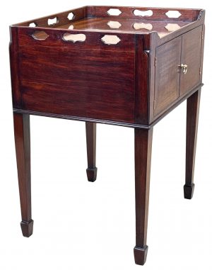 This is a great quality, elegant, example of an 18th century georgian bedside pot cupboard. The table is constructed from good quality mahogany timber and boasts real elegance to its unusual design. We describe the design as unusual as its more common for these little cupboards to just have one wide single door, as opposed to the double doors which feature in this example. We think it really adds to the overall look of the piece.