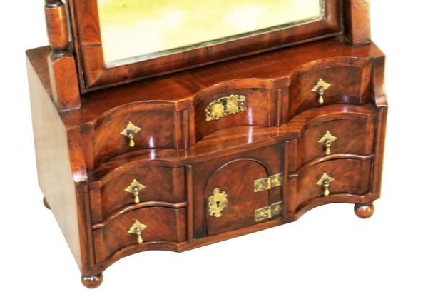 A charming early 18th century Queen Anne period Walnut dressing table mirror having old arched mirror Plate set inside attractive moulded frame with elegant Turned upright supports over unusual stepped base With arrangement of drawers flanking central cupboard Door with secret interior drawer (A superb example of its type this early 18th century dressing table mirror is constructed using good quality walnut veneers which have aged gracefully over time to create a gorgeous mellow color and patina which is of course impossible to replicate. The quality throughout is fantastic as is the relatively unique design, including the little secret drawer contained within the arched door and it was clearly made in a top workshop.)