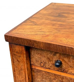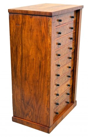 This is constructed from a very high grade of highly figured, rich walnut which retains an exceptional colour and patina and also the secondary timbers used are of the highest quality, with mahogany drawer linings for example.