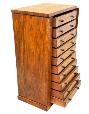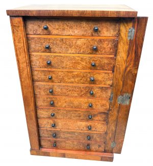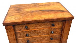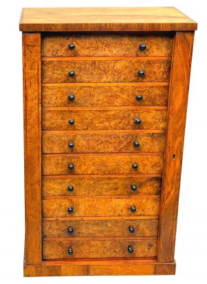 19th Century Childs Size Burr Walnut Wellington Chest Of Drawers (England, circa 1860)