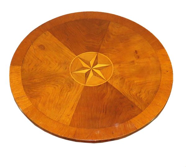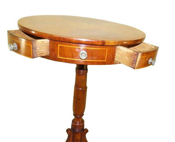 A very attractive early 19th century mahogany, walnut and olivewood occasional lamp table having drum type circular rotating top with segmented veneers and central set inlaid star over four frieze drawers and four false drawers raised on elegant turned central stem with elegant tripod legs. (A very attractive little occasional table that could be used for a variety of different spaces around the home with various different features that really give it a touch of extra class and elegance. The rotating top is beautifully figured and the veneers have been cleverly laid to create the segmented, or radiating, effect around the central set star.).