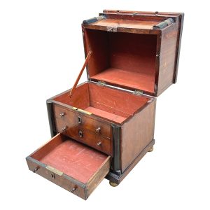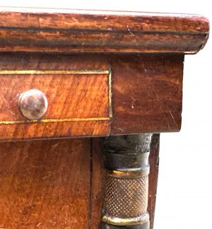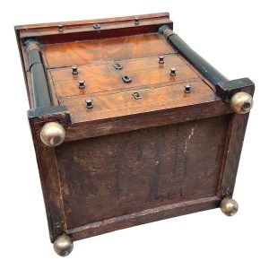 This particular piece was almost certainly made as a travelling salesman’s sample piece, due to it being really rather rare to find a miniature escritoire of any kind, let alone one of this stature and level of detail, right down to the brass decoration at the top of the ebonised columns.
