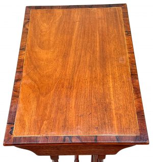 The top of each table is constructed from well figured, rich mahogany timber with elegant cross banded decoration. The combination of these features creates a good contrast and an elegant look in combination with the boxwood stringing.
