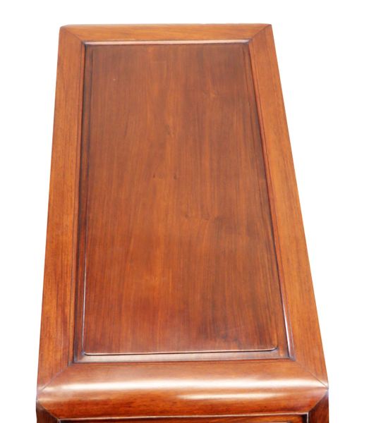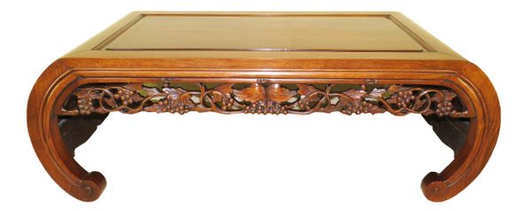 A Very Good Quality Mid 19th Century Oriental Hardwood Opium Coffee Table Having Well Figured Panelled Top Of Good Colour With Carved Pierced Frieze Raised On Elegant Curved Ends With Blind Carved Decoration (Often referred to as opium tables due to the similarity in design to similar tables used in their home country for the locals to sit on the floor around and smoke their opium these types of coffee tables were produced around the end of the 19th century in China specifically to be shipped to the western markets. These days they serve a purpose that very few other types of genuinely antique furniture can, in that they are usually the right height to be used as a coffee table in modern interiors. Also the fact they are constructed from an extremely dense and hard wearing oriental hardwood means that they are not easily damaged by spilt, or hot, drinks)