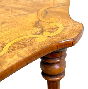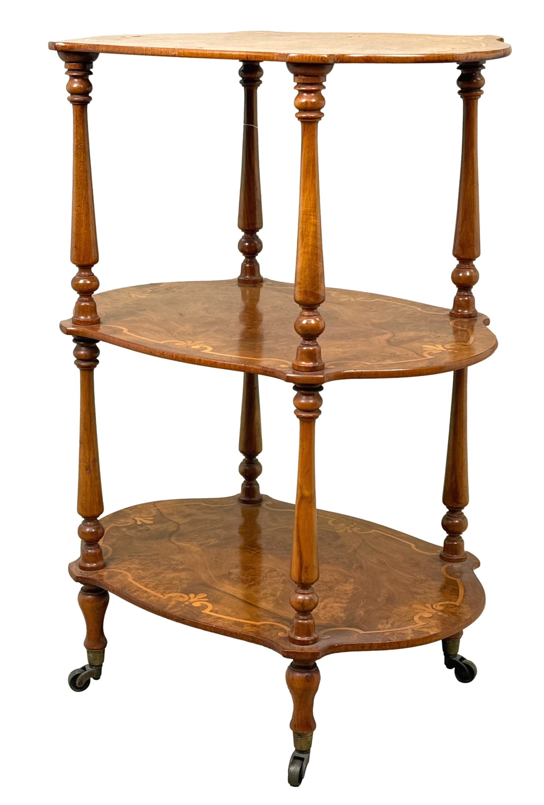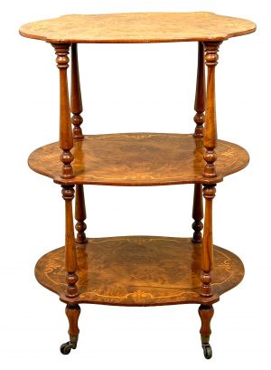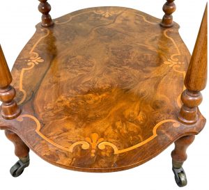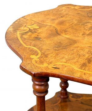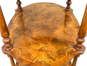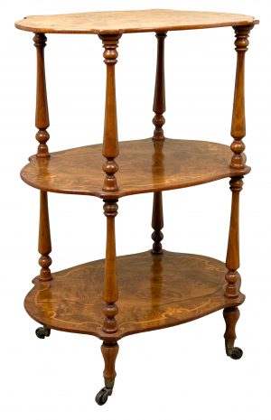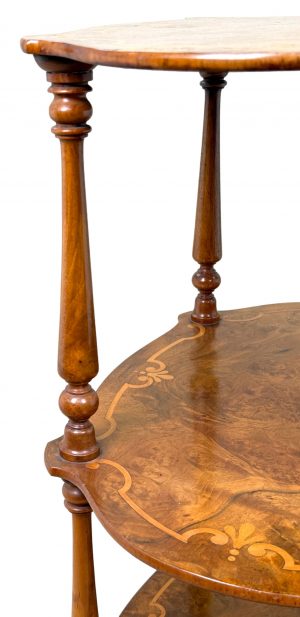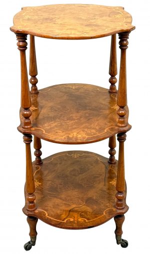 An Extremely Attractive Mid 19th Century Victorian Burr Walnut & Walnut Étagère, Or Small Whatnot, Having Three Superbly Figured Rounded Tiers With Attractive Inlaid Decoration, United By Elegant Turned Upright Supports With Baluster Turned Tapering Legs And Original Brass Castors.