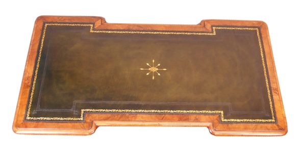 A Very Fine Quality Mid 19th Century Burr Walnut Pedestal Desk Having Gilt Tooled Inset