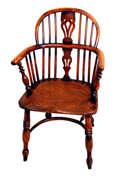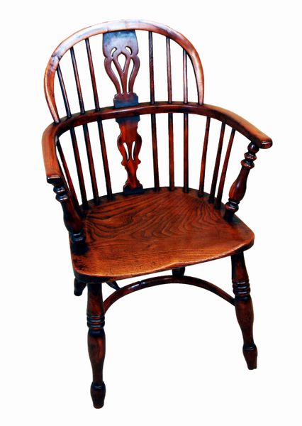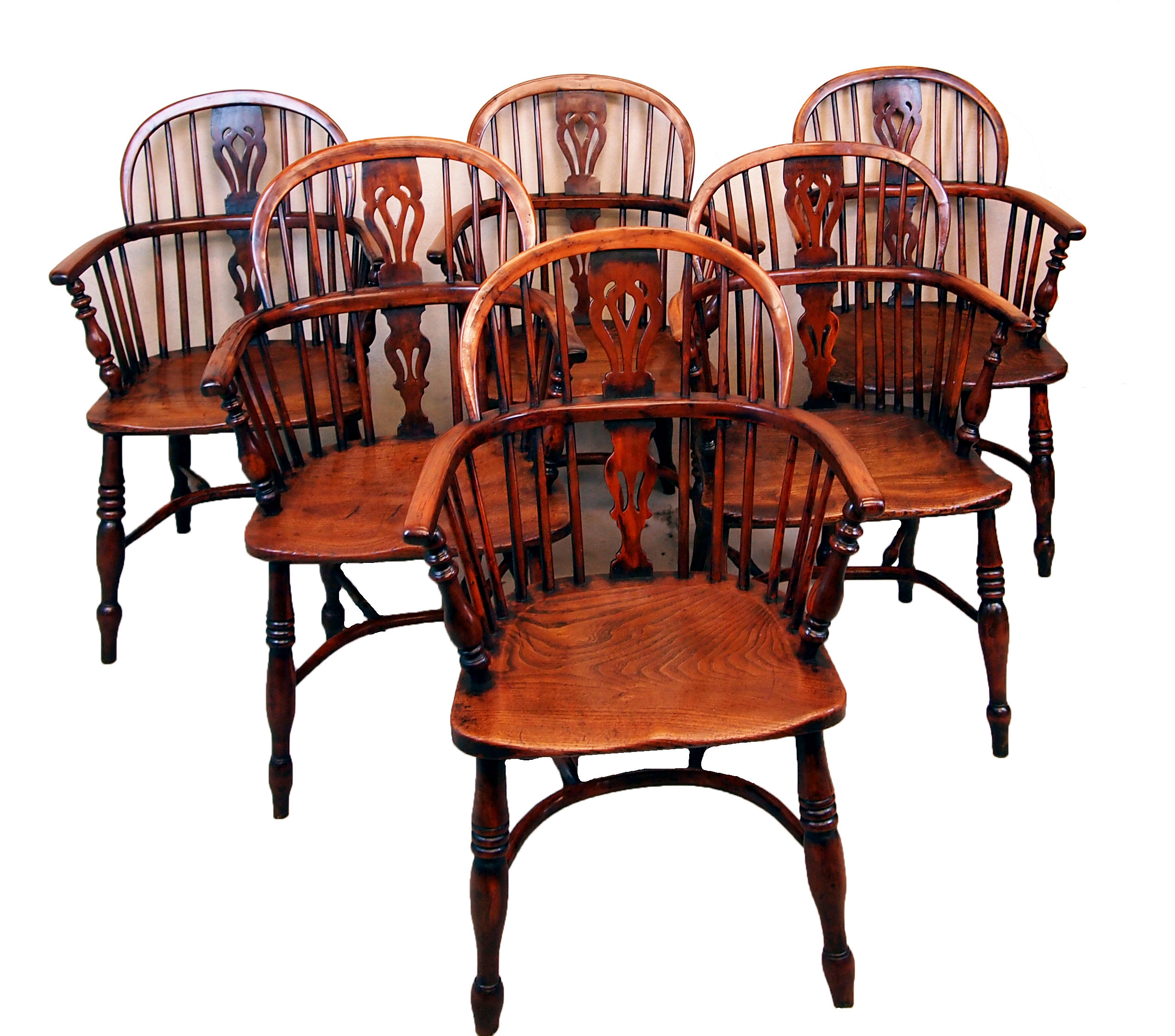 A Delightful Mid 19th Century Matched Set Of Six Yew Wood Low Back Windsor Armchairs Having