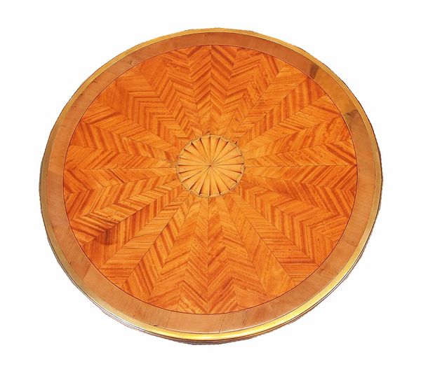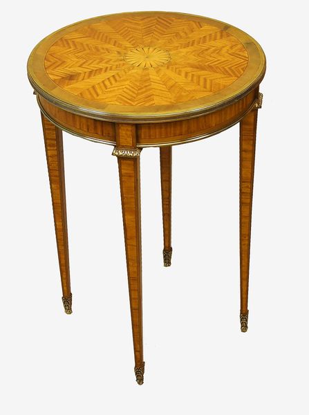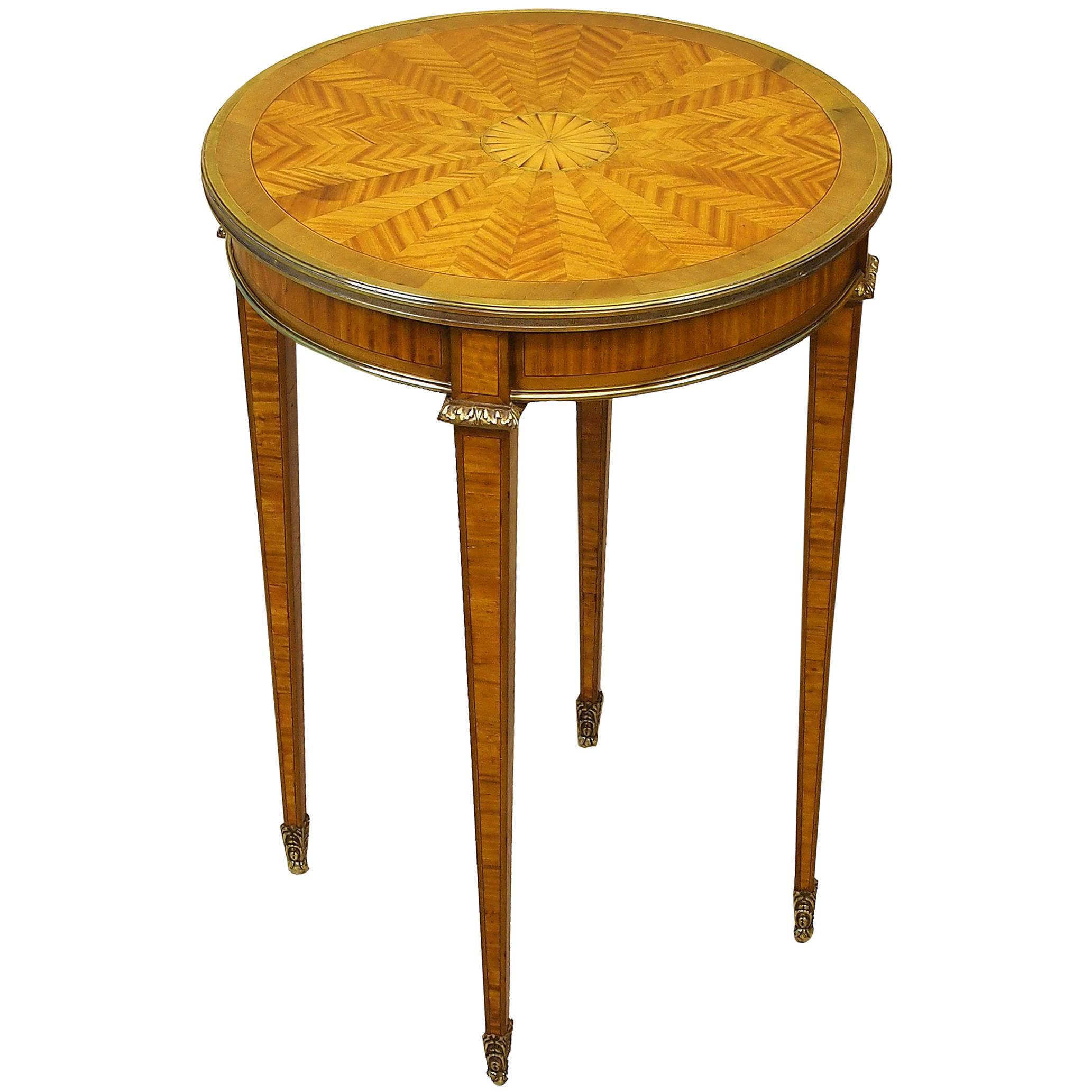 An exceptional quality 19th century French satinwood occasional lamp table having segmented and inlaid circular top with brass moulded edge raised on elegant square tapering legs with ormolu mount decoration terminating on ormolu feet.