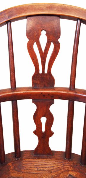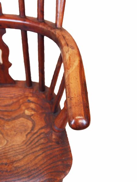 A delightful 19th century yew, ash and elm child’s size windsor armchair having attractive pierced splat back raised on turned legs united by crinoline stretcher.