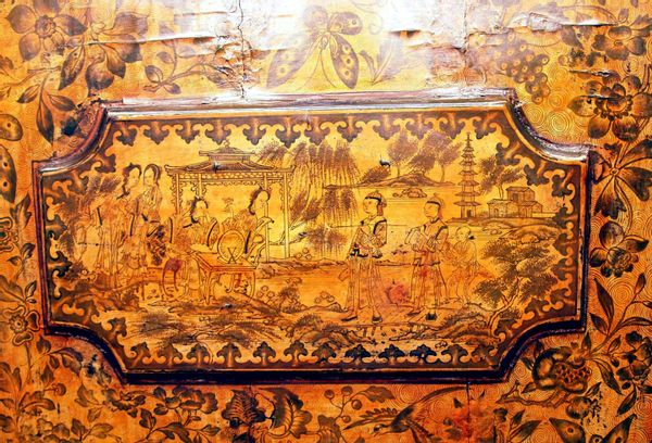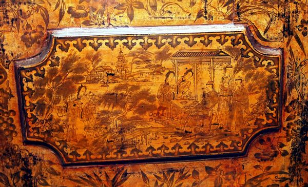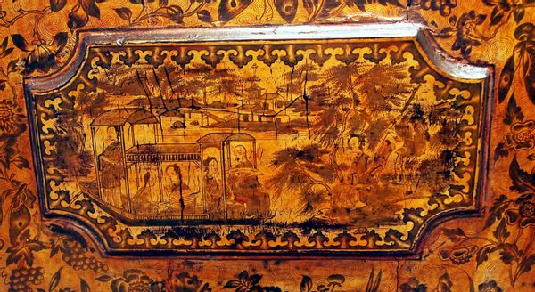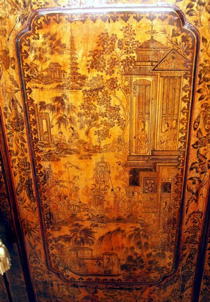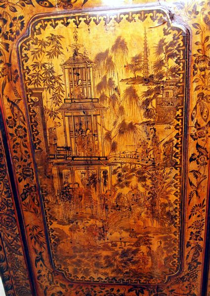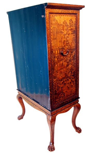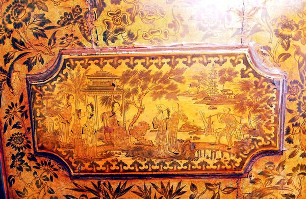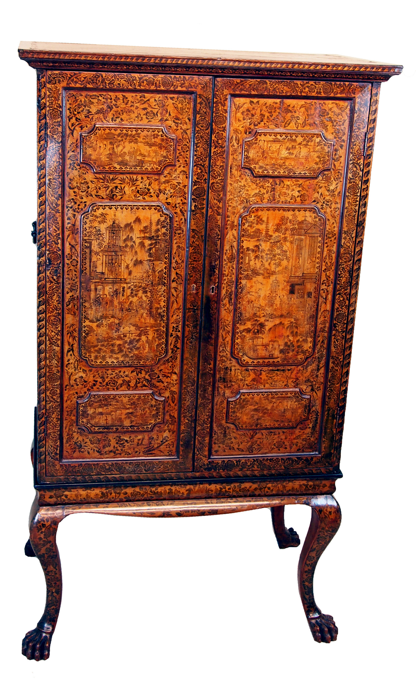 Exceptional Chinoiserie And Penwork Decoration To Panelled Doors Enclosing Shelves