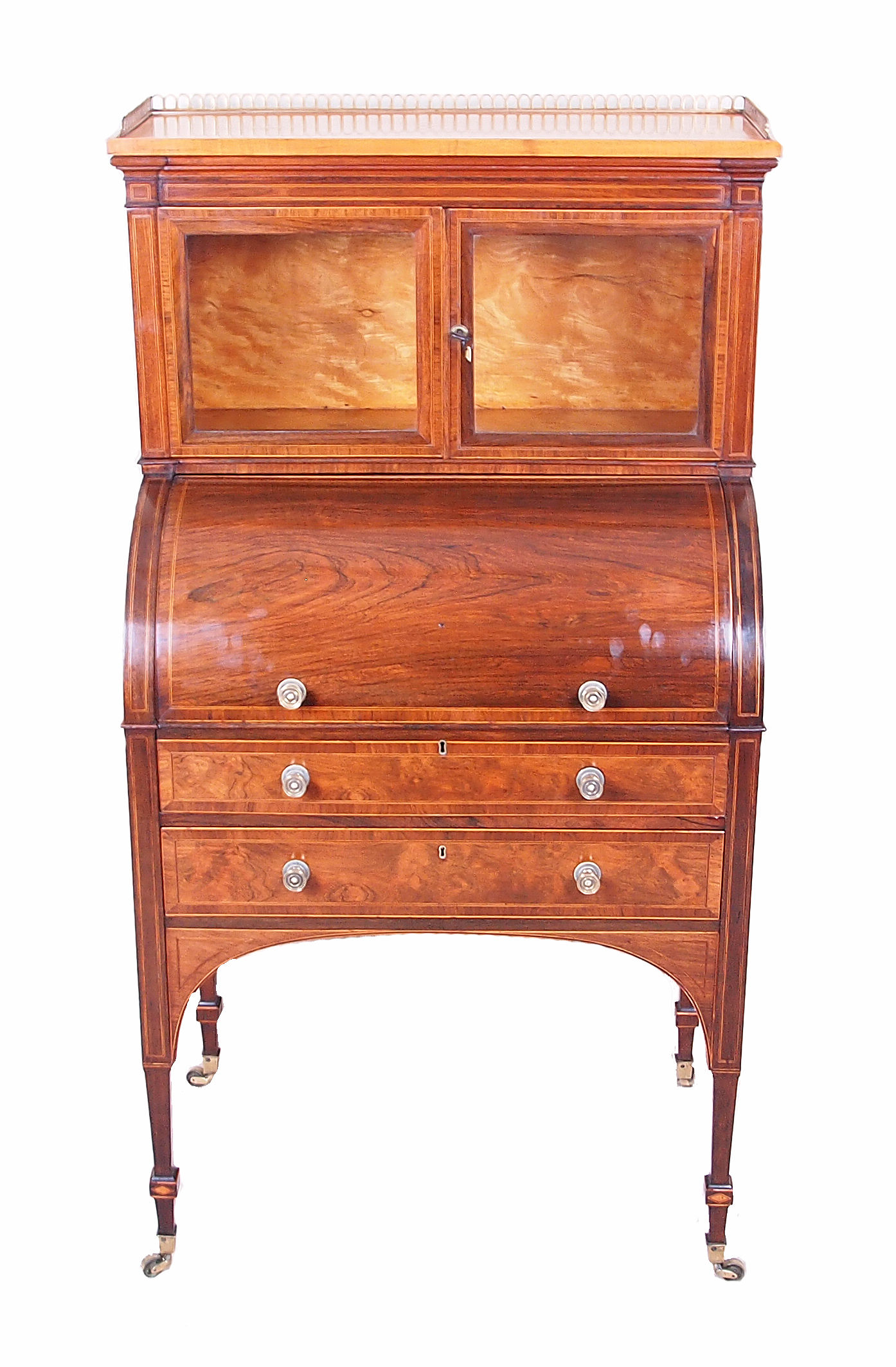Bureau Having Glazed Cabinet Doors Above Roll Top And Two Long Drawers