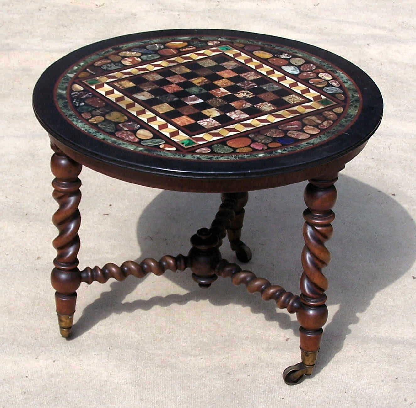 A Beautiful And Superb Quality Victorian Occasional Table Having Specimen Marble Top Inlaid With A Chess Board And Standing On An Original Barley Twist Turned Leg And Stretcher Stand Stamped With A Makers