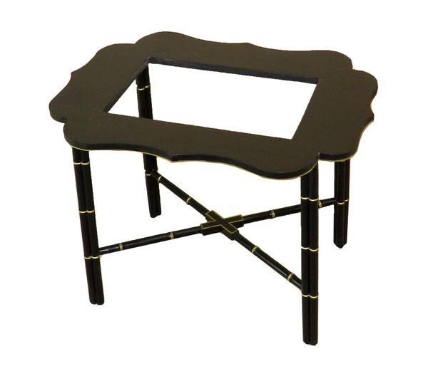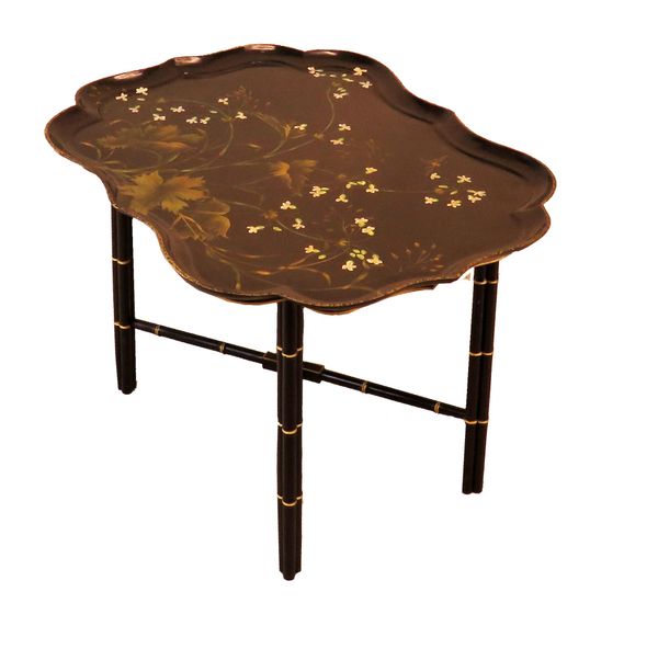 A very attractive mid-19th century papier mache tray having shaped sides and hand painted decoration raised on later faux bamboo stand (What better way to look after the environment than to recycle beautiful, old, antique objects with little purpose in the modern world and give them a new purpose. Thats exactly what’s happened to this pretty Papier Mache tray. It is now a very attractive and very functional coffee table or even just side table, with the added bonus that the tray is still removable and can therefore be used as an actual tray as and when required. This particular tray is in good condition although there are certainly signs that it has seen plenty of use throughout its life. There are a few old cracks and digs and some of the gilded decoration around the edge has been re-touched at some point. The painted decoration itself is in excellent condition and extremely vivid in design. The stand is also slightly nicer than you would often expect to see with somebody having gone to the trouble of creating cluster column legs.)