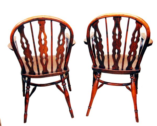 Yew Wood Windsor Armchairs Having Three Pierced And Shaped