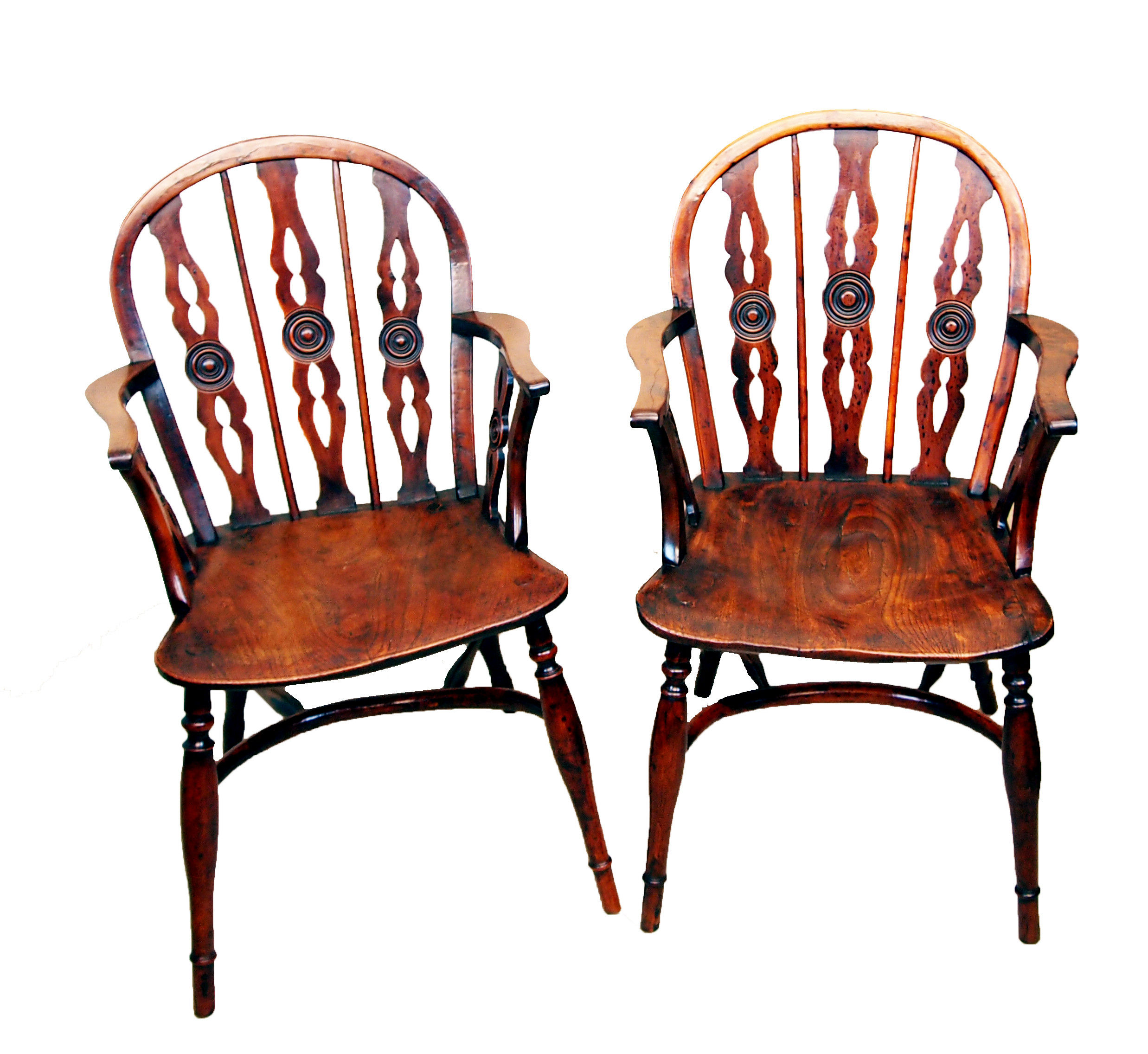 Yew Wood Windsor Armchairs Having Three Pierced And Shaped