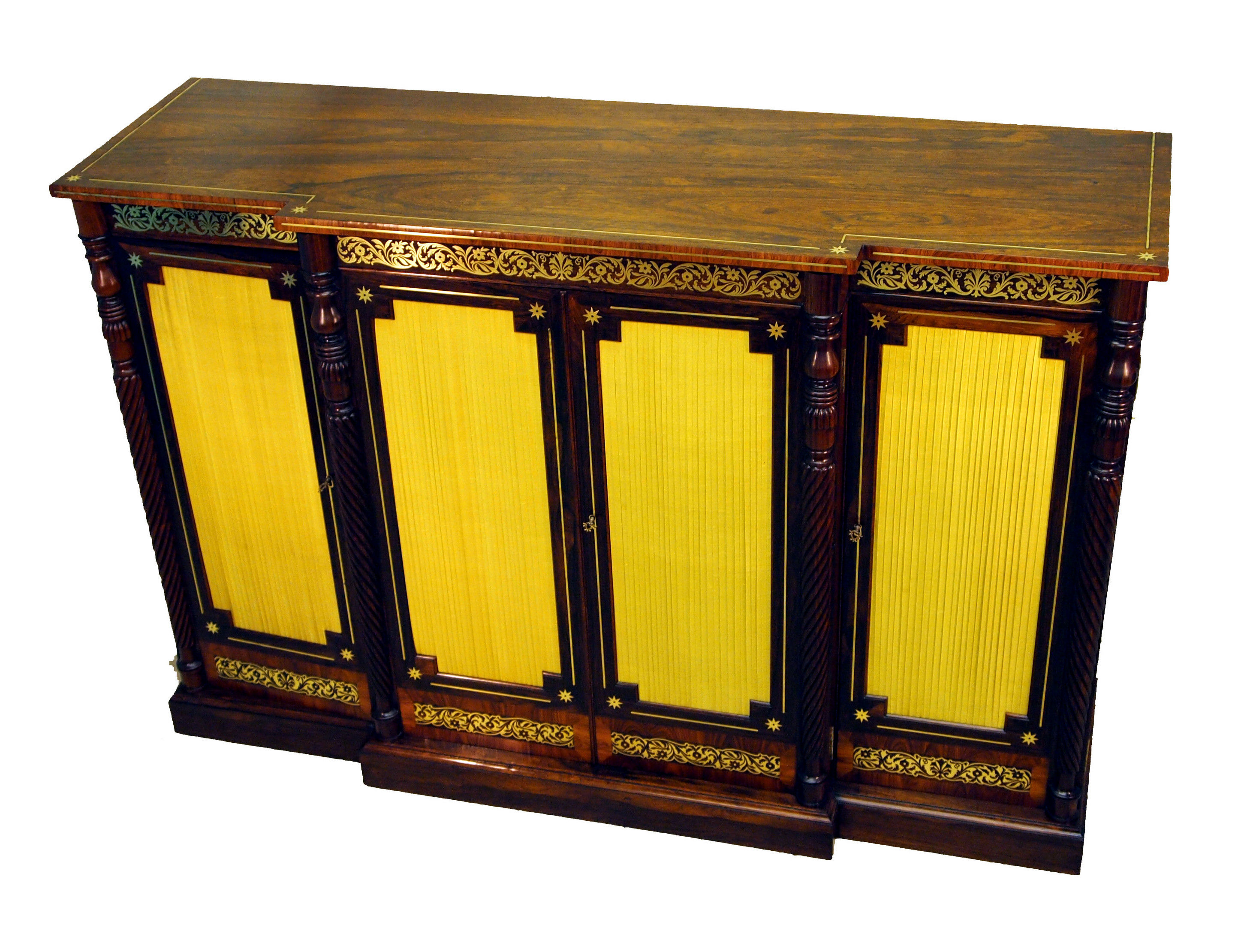 A Stunning Quality Regency Period Rosewood Breakfront Side Cabinet The Highly Figured Top Above Four Silk Panel Doors Concealing Drawers To Centre And Sliding Trays To Ends, Flanked By Elegant Ropetwist Turned Columns And Profusely Inlaid With Brass Throughout Standing On Original Plinth Base