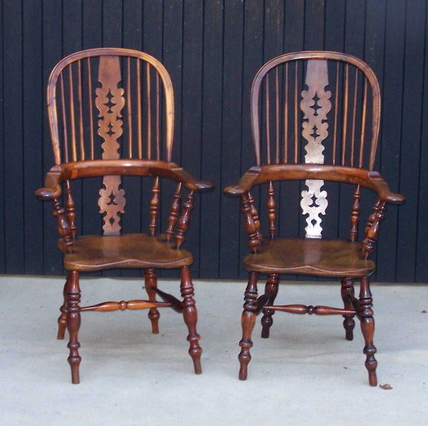 A Fantastic And Rare Set Of 8 Matched Yewood Broad Arm Winsor Chairs With Shaped Splats To Backs and Turned Legs With Understretchers, Being Of Glorious Colour And Patina Throughout