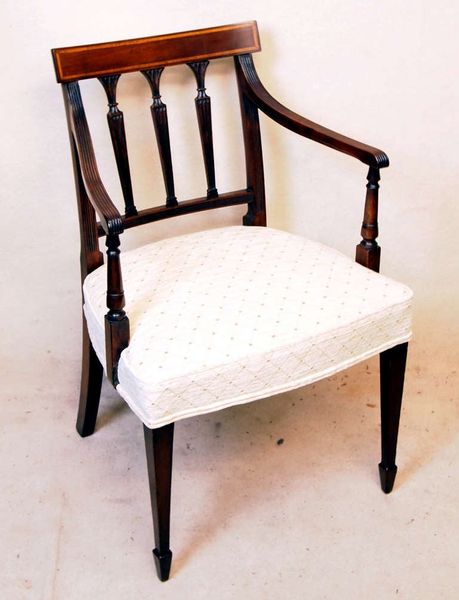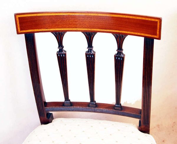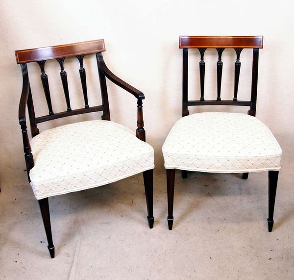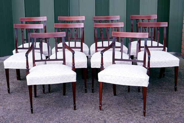 A fine set of ten (eight singles and two carvers) George III period. Mahogany dining chairs having well figured curved top rails with satinwood cross banded decoration above three carved and fluted supports raised on elegant square tapered legs terminating on spade feet.