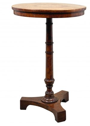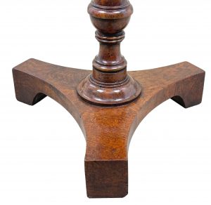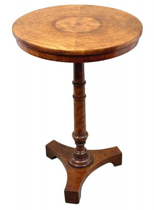 A Very Good Quality And Particularly Attractive Mid 19th Century William IV Period Pollard, Or Burr, Oak Occasional Lamp Table Having Exceptionally Well Figured Circular Top, With Radiating Quarter Veneers And Lovely Central Set Panel, Raised On Elegant Turned Centre Support Column With Triform Base And Arched Bracket Feet.