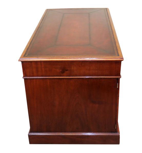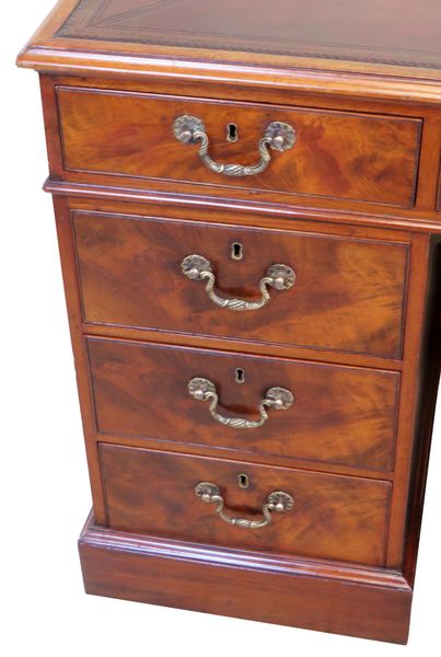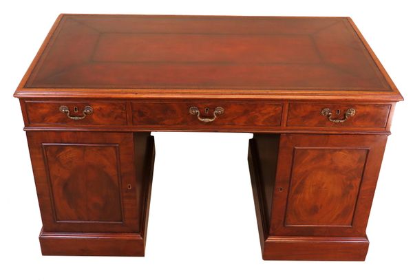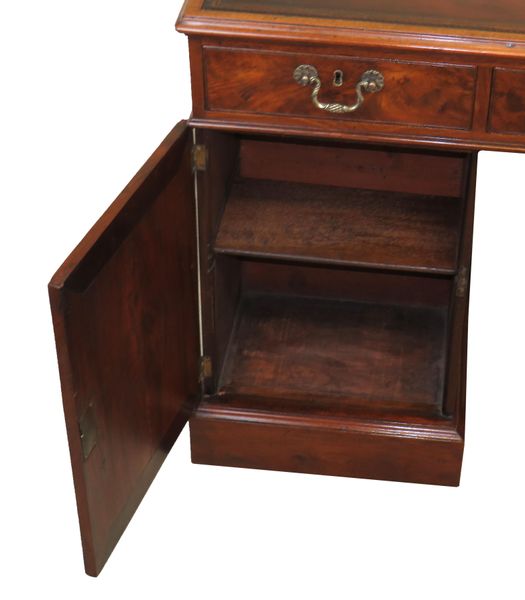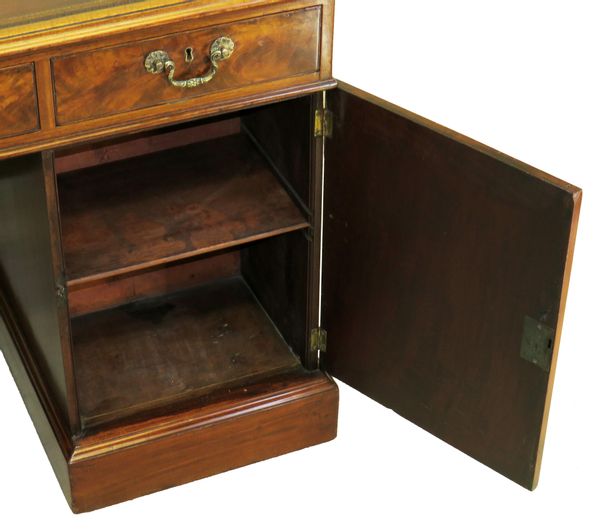 A rare 18th century mahogany Georgian pedestal partners desk having recently replaced tooled leather inset to crossbanded top over nine superbly figured drawers with later brass handles to front and three drawers over panelled cupboard doors to reverse raised on original plinth base circa 1760 Measures: Height 31.5in Width 53in Depth 29in Kneehole dimensions: Height 25in x width 21in (Desks are functional pieces of furniture and generally heavily used throughout the years, hence why not many examples from the 18th century have survived in any kind of sensible condition. This particular example has beautifully figured drawers and cupboard doors and the replacement brass handles have clearly been in place for some time, are of the style it would originally have had and fit exceptionally well with the piece. The desk is also a good functional size for the modern home or office and not overpoweringly big like a lot that come to market. Also it handily breaks down into 3 sections, which many 18th century examples don’t, making it easy to get into even the most challenging of environments).
