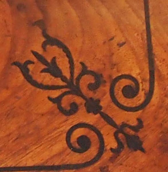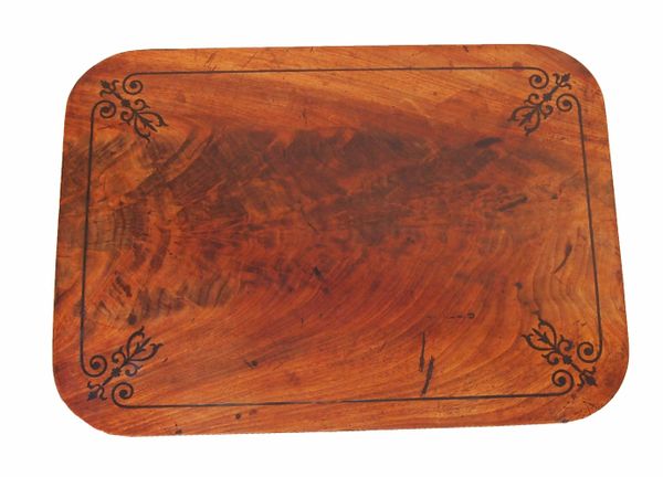 A fine quality Regency Period mahogany lamp, or wine, table having superbly figured oblong top with attractive ebonized inlay decoration raised On elegant turned central column and quadform base with carved paw feet (This is a particularly fine quality and elegant Regency lamp table with almost every feature large, or small, being comfortable above the norm in terms of quality, craftsmanship and design. The top is superbly figured and retains an excellent color and patina which is in no small part due to the excellent choice of timbers. The column is elegantly shaped with superbly executed carved decoration in the middle of it. The plateau base and four carved paw feet are again of the highest quality and superbly executed. Overall the condition is good with just various old marks, dents and scuffs. There is however a significant warp to the top, which is noticeable, but is not so significant that it means the table cannot be used. It also of course adds great character to the piece. All in all a fabulous little table that would work beautifully in an absolute plethora of locations around the home and that one would almost certainly never tire of admiring.)