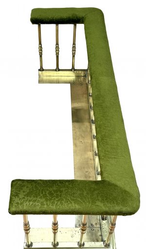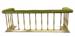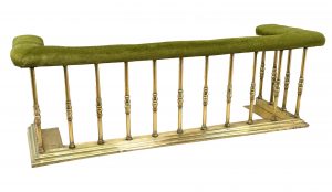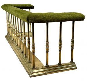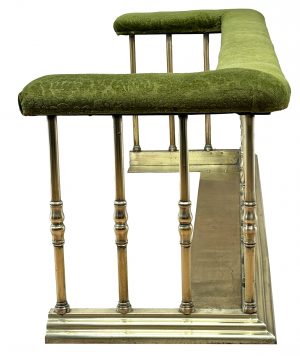 An Exceptional Quality And Relatively Large Mid 19th Century Victorian Period Brass Club Fender, Having Fabric Upholstered Bench Seat, Raised On Extremely Elegant Turned Supports, Of Full Height All The Way Around, Having Step Moulded Kerb To Base.