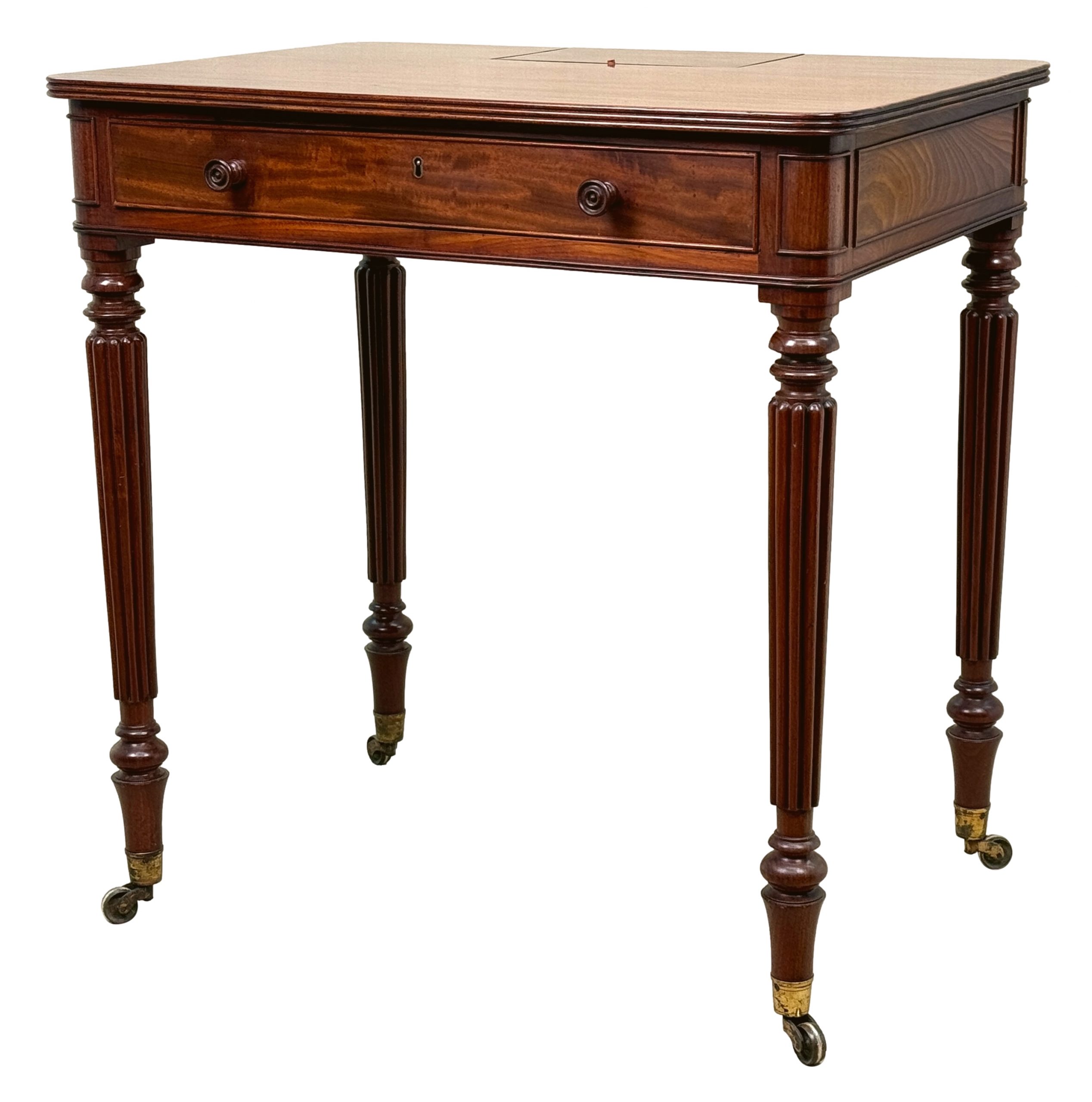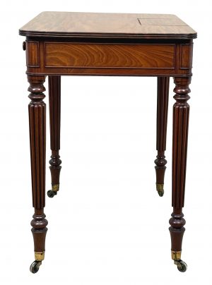 An Exceptional Quality Regency Period Mahogany Chamber Writing Table, In The Manner Of Gillows Lancaster, Having Superbly Figured Top With Hinged Flip Flap To Back, Enclosing Pen Tray And Inkwell Divisions, Over One Drawer With Original Turned Knobs And Cockbeaded Panels To Frieze On All Sides, Raised On Fine, Elegant, Turned Reeded Legs With Original Brass Castors.