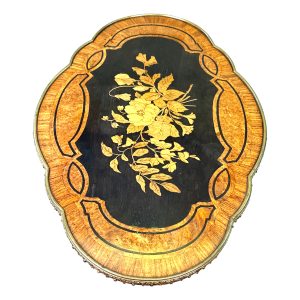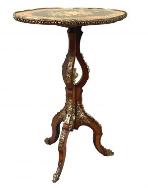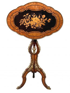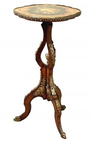 An Exceptional Quality Late 19th Century French Burr Walnut & Kingwood Wine Table, Or Lamp Table, Having Beautiful Shaped Tilt Top With Central Set Ebonised Panel And Marquetry Inlaid Decoration, Flanked By Ormolu Mounted Edge, Raised On Scrolling Central Supports And Tripod Legs With Profuse Ormolu Gilt Bronze Mounted Decoration Throughout.
