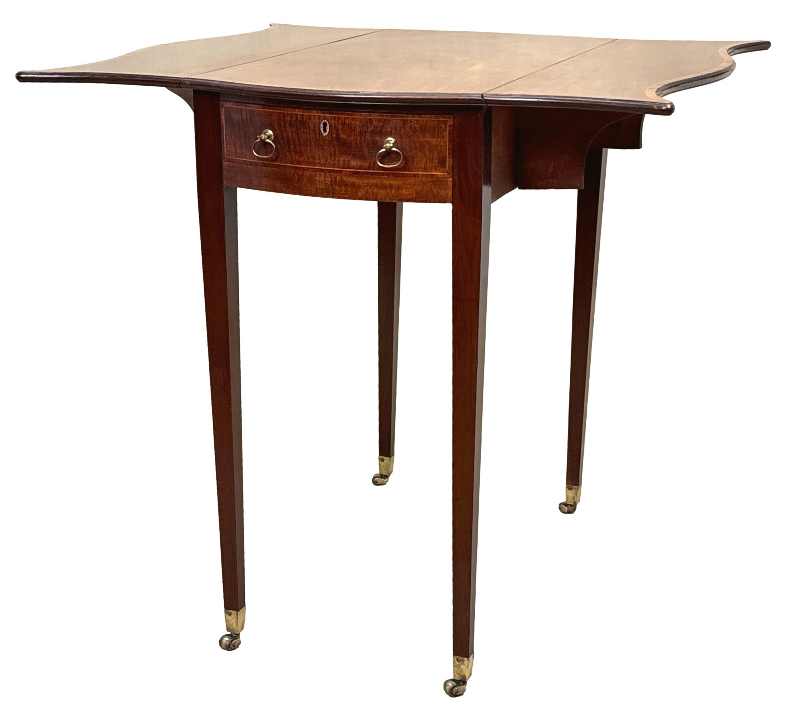 A Very Good Quality Late 18th Century, Georgian Hepplewhite Period, Mahogany Baby Pembroke Table, Having Well Figured Butterly Shaped Drop Flap Top, With Attractive Crossbanded Decoration, Over One Frieze Drawer To Front And One False Drawer To Reverse, Retaining Original Brass Axe Drop Handles, Raised On Elegant Square Tapered Legs With Original Brass Castors.