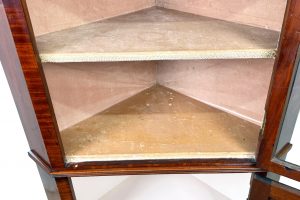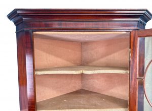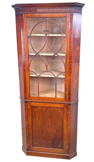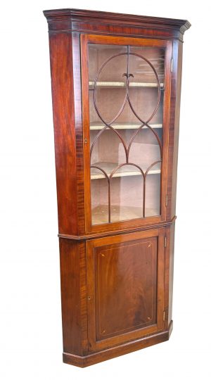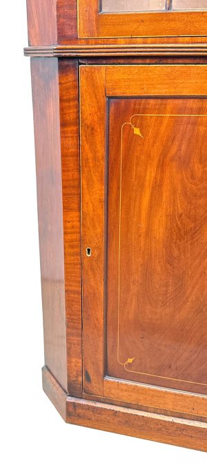 This corner cabinet was constructed towards the end of the 18th century using good quality and well figured mahogany, which has retained an attractive colour. It also has some particularly elegant inlaid strung decoration which really lifts the piece.