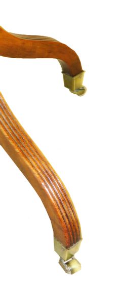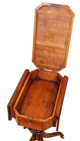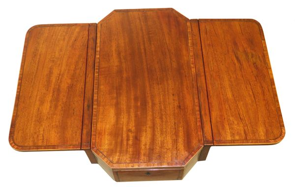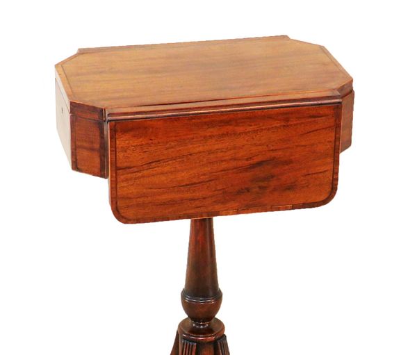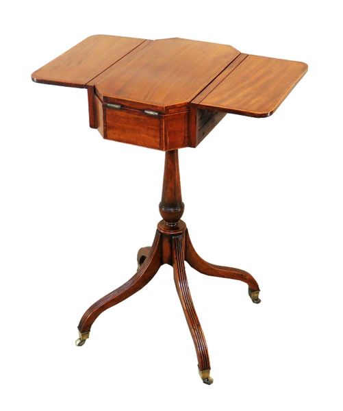 A delightful George III period mahogany occasional table having superbly figured and crossbanded lift up top with two flaps raised on elegant turned central column terminating on four splay reeded umbrella legs retaining original brass castors (This table of quite unusual design has a real charm to it and is a useful, functional size. It is well constructed with crossbanded decoration and the two flaps add good versatility in terms of size.), circa 1790 Measures: Height 29.5in Width 11.5 in (flaps down) Width 23 in (flaps up) Depth 16 in.