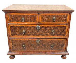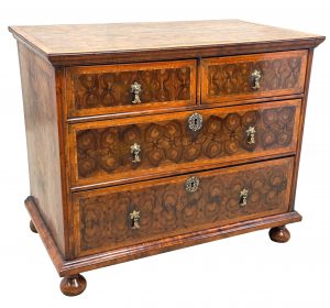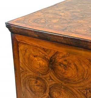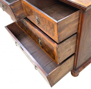 This is a great example of a late 17th century oyster veneered chest, with great care and attention to detail paid to the decoration of the top and the drawer fronts. Some examples can be somewhat lacking in terms of the effort which has actually been put into the construction of the piece, relying heavily just on the decorative effects of the oyster cuts themselves, but this piece certainly isn’t one of those.