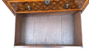 Just as much effort has gone into creating a pattern on the ends as well as the rest of the piece which is relatively unusual and also the secondary timbers are of a very high quality, which means the chest remains in excellent condition.