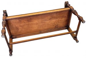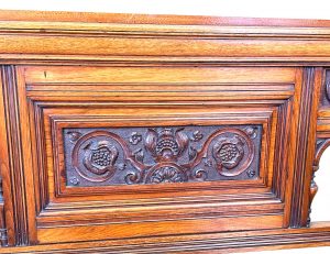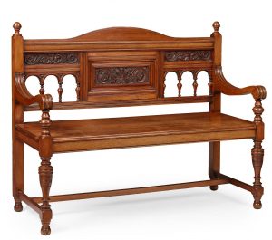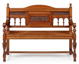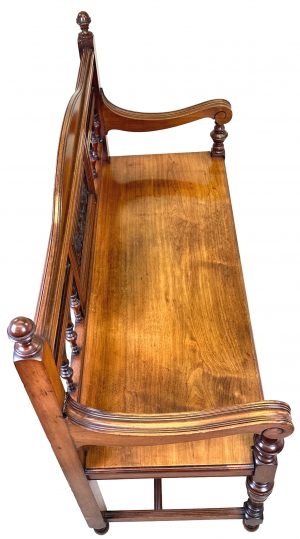 This is a great example of its type, boasting fantastic carved decoration and elegant details such as the finely turned finials, tapered legs and spindle arches. Another great feature is that whilst being extremely well executed and undoubtedly aesthetic movement in design, this particular hall bench is no so elaborate that it would not fit with any other items of furniture around the home. In fact we think quite the opposite, this hall bench would work in just about any existing interior, with just about any existing furniture scheme.