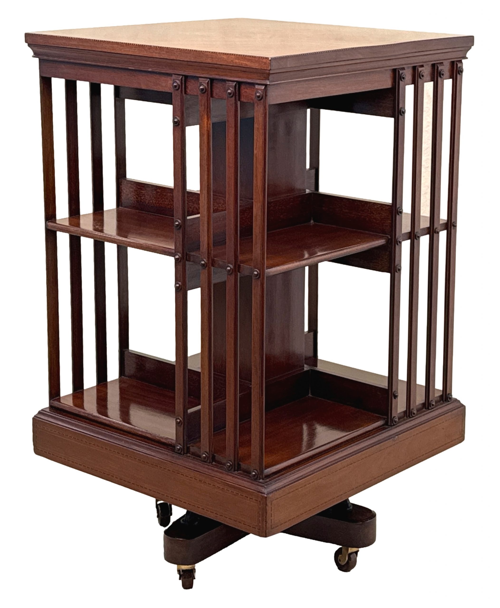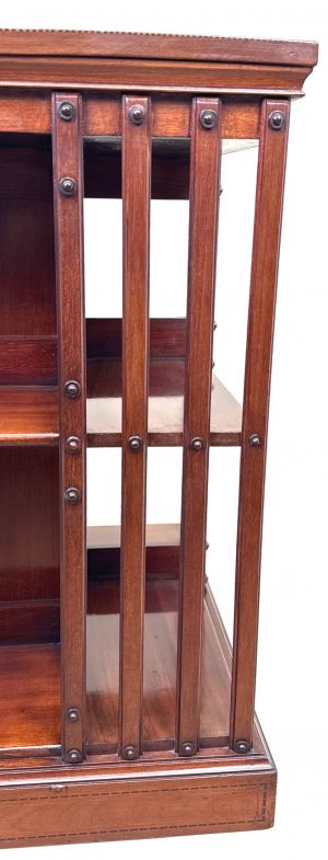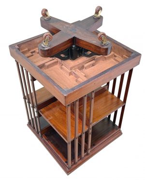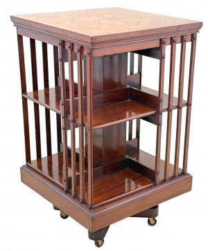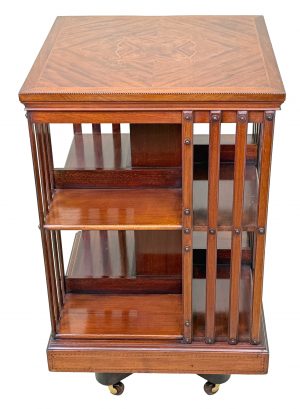 You will note that this particular revolving bookcase has some very attractive inliad decoration to the top, which in combination with the superbly figured mahogany makes it very elegant indeed. It also has a metal base and this adds to the practicality, making it very sturdy and fit for purpose.