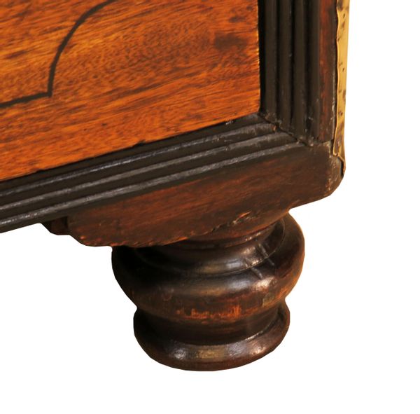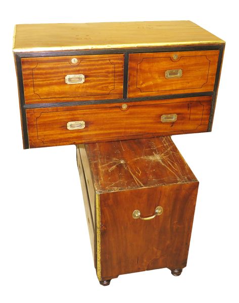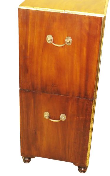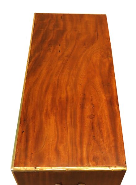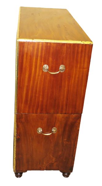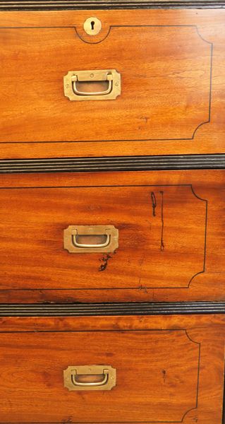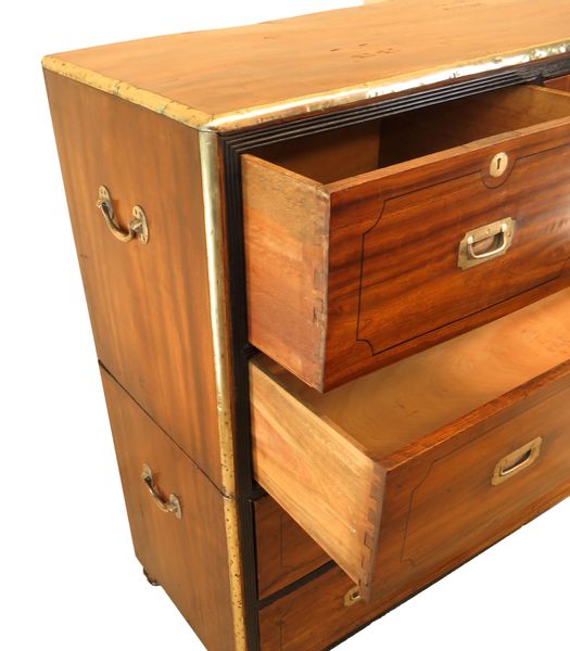 A superb quality mid-19th century camphor wood military campaign chest having well figured top over two short and three long drawers with ebonized decoration & original flush fitting brass handles raised on original turned feet with brass bound decoration to edges throughout (Military campaign chests as the name suggests were originally made for easy transportation around the battlefield. A few features specific to this purpose are the two part construction for ease of movement, the flush fitted brass handles and brass bound decoration designed to ensure there are as few bits “poking out” that which are likely to snagged during movement. Example is constructed from camphor wood which is many people regard as the best quality of the woods used to construct these type of chests from with the added bonus which camphor wood offers of a strong but very pleasant aroma inside the drawers which is very much intended to keep the moths, insects and bugs away.)