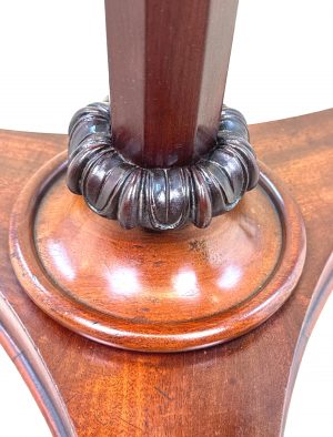 A Very Good Quality Mid 19th Century, William IV Period, Mahogany Lamp Table, Or Occasional Table, Having Superbly Figured Circular Top With Attractive Chess Board Inlaid Decoration, Raised On Reverse Tapering, Faceted, Column With Finely Carved Collar, To Triform Base With Original Carved Paw Feet.