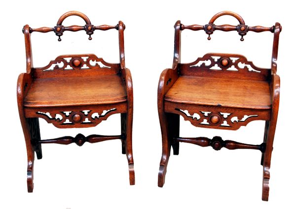 Antique Pair Oak Gothic Window Seat Stools