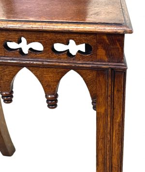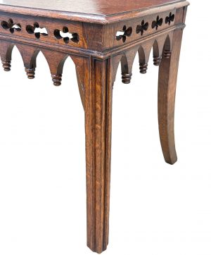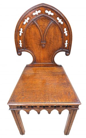 A Very Attractive Mid 19th Century, Gothic Design, Figured Oak, Pair Of Hall Chairs, Having Very Elegant Swept Arch Back Supports With Applied Cockbeading Decoration And Pierced Quatrefoils, Over Well Figured Seats And Elegantly Carved Frieze, Raised On Square Moulded Legs To Front And Swept Legs To Back.