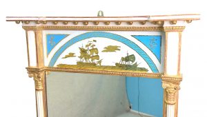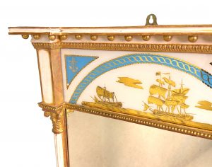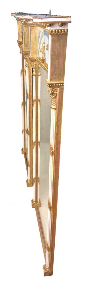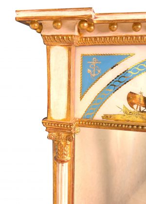 An Extremely Attractive And Rare Large Pair Of Early 19th Century, Regency Period, Paint Decorated And Parcel Gilded Pier Mirrors, Of Tall Rectangular Form, Incorporating Wonderful Naval Ship Scenes To Coloured Reverse Painted Verre Eglomise Mirror Glass, Over Replacement Large Mirror Plates Flanked By Elegant Half Turned Reeded Columns With Foliate Wrapped Decoration, Headed By Scrolling Carved Capitals.