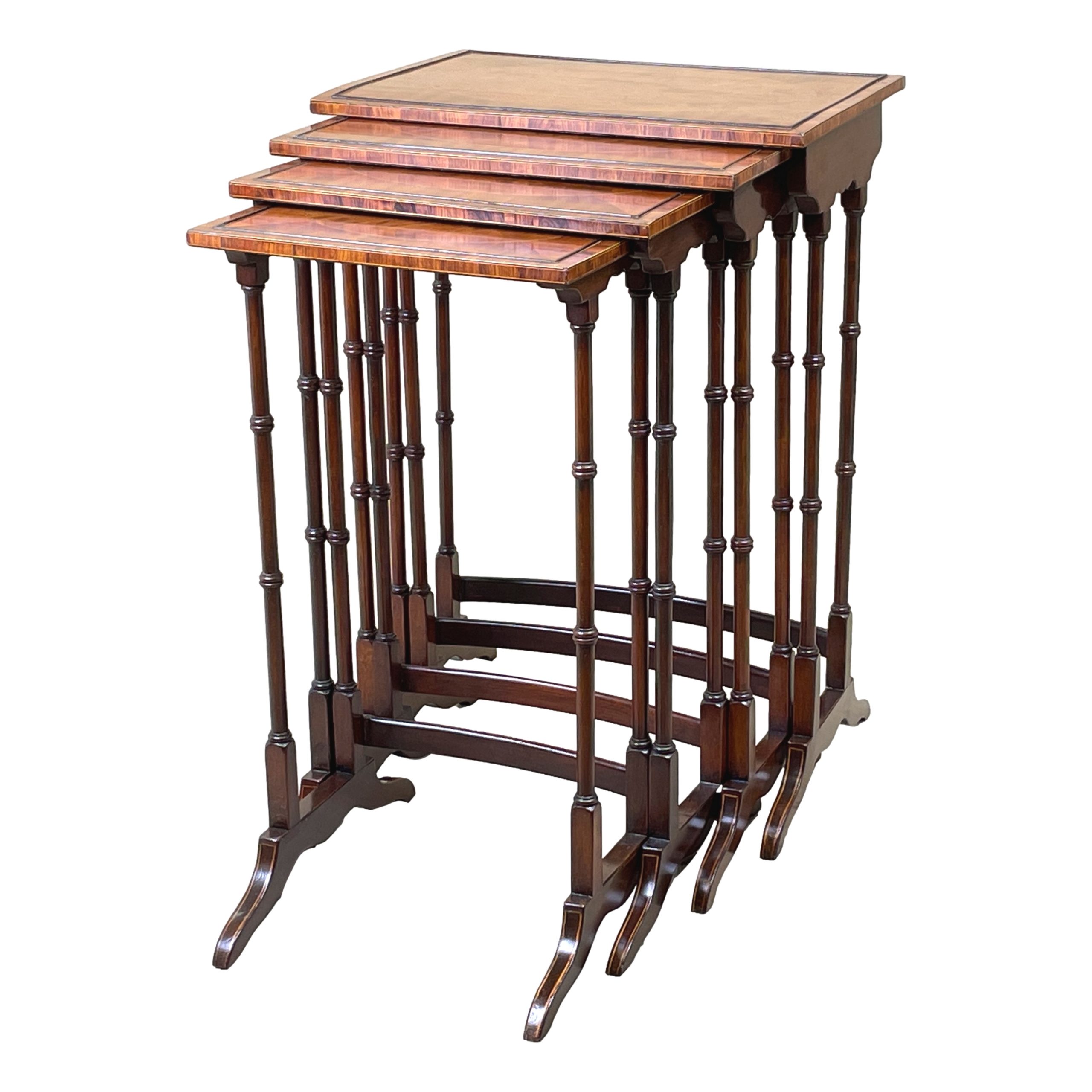 A Very Fine Quality Quartetto Nest Of Four Mahogany Coffee Tables, Having Superbly Figured Oval Panels To Inlaid And Crossbanded Panelled Tops, Raised On Elegant Turned Upright Supports United By Curved Stretchers, Terminating On Sabre Feet With Strung Decoration.