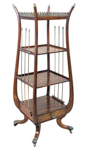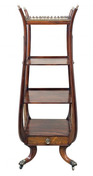 An Exceptionally Fine Quality And Extremely Rare 19th Century Late Regency Period Rosewood And Brass Mounted Whatnot, Or Etagere, Of Baluster Form, Having Fine Ormolu Gallery To Top Tier, Two Middle Tiers With Galleried Edge And Further Bottom Tier Over Drawer, The Sides With Elegant Swept Supports And Lyre Design Brass Rods Headed By Pine Cone Finial Decoration, The Drawer With Original Brass Handle Over Elegant Swept Legs With Original Brass Paw Castors.