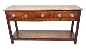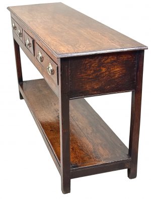 A Charming Mid 18th Century, George II Period, Oak Dresser Base, Or Sideboard, Of Relatively Small Proporrtion, Retaining Excpetional Rich Colour Throughout, Having Rectangular Top Over Three Drawers To Frieze, With Replacement Brass Oval Plate Handles, Raised On Square Upright Supports With Original Potboard Shelf Below.