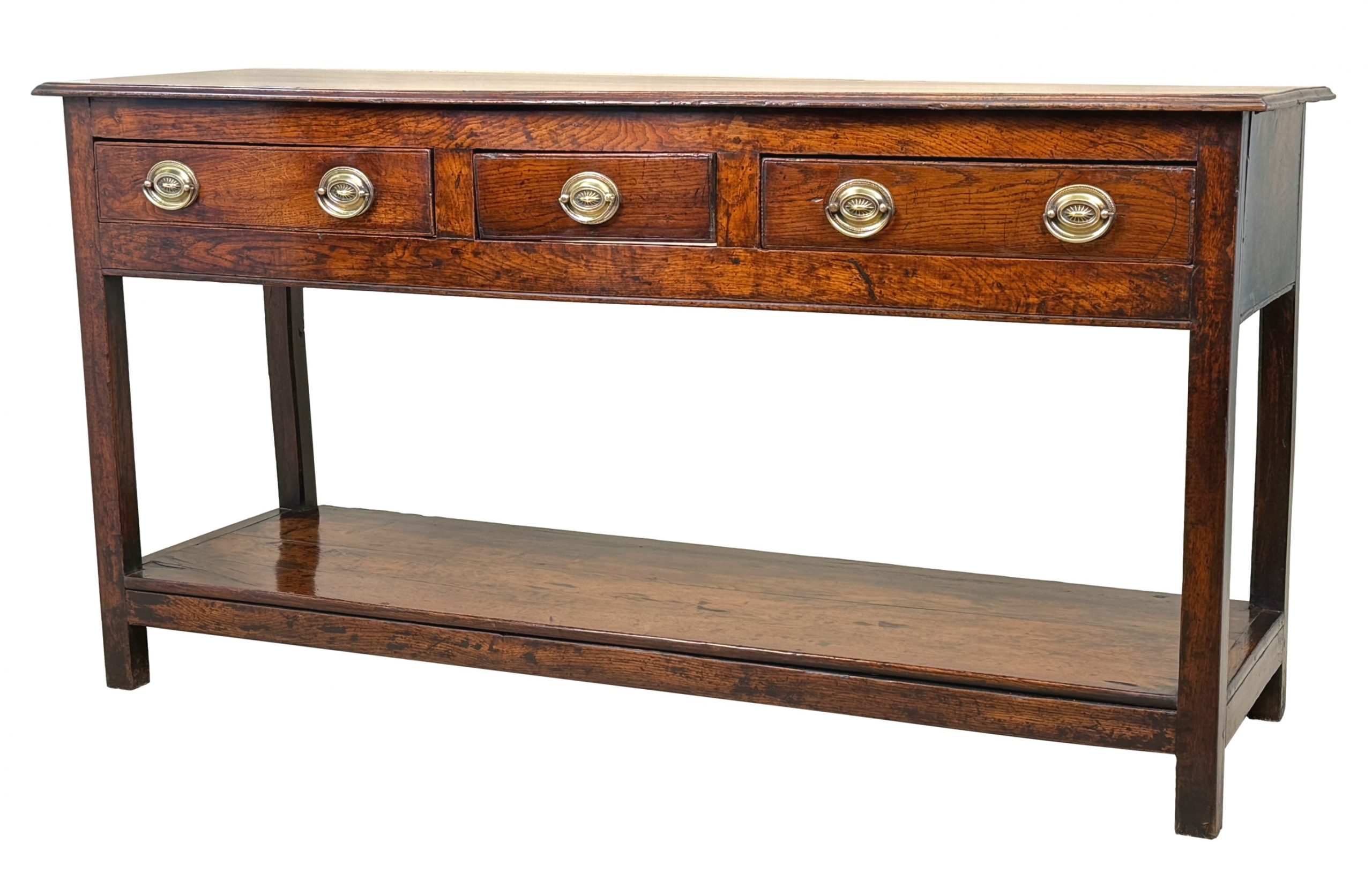 A Charming Mid 18th Century, George II Period, Oak Dresser Base, Or Sideboard, Of Relatively Small Proporrtion, Retaining Excpetional Rich Colour Throughout, Having Rectangular Top Over Three Drawers To Frieze, With Replacement Brass Oval Plate Handles, Raised On Square Upright Supports With Original Potboard Shelf Below.