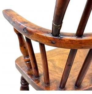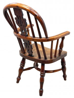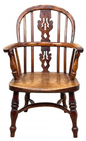 This beautiful childs windsor chair is constructed from yew wood which is a really good feature and it also boasts a crinoline stretcher. Not all windsor chairs had crinoline stretchers, especially childs examples, and most have standard H stretchers to support the legs, but there is something incredibly elegant about the swept crinoline stretchers. It is believed the term crinoline is borrowed from the crinoline petticoats which 19th century ladies would utilise below their dresses to enhance their silhouette.
